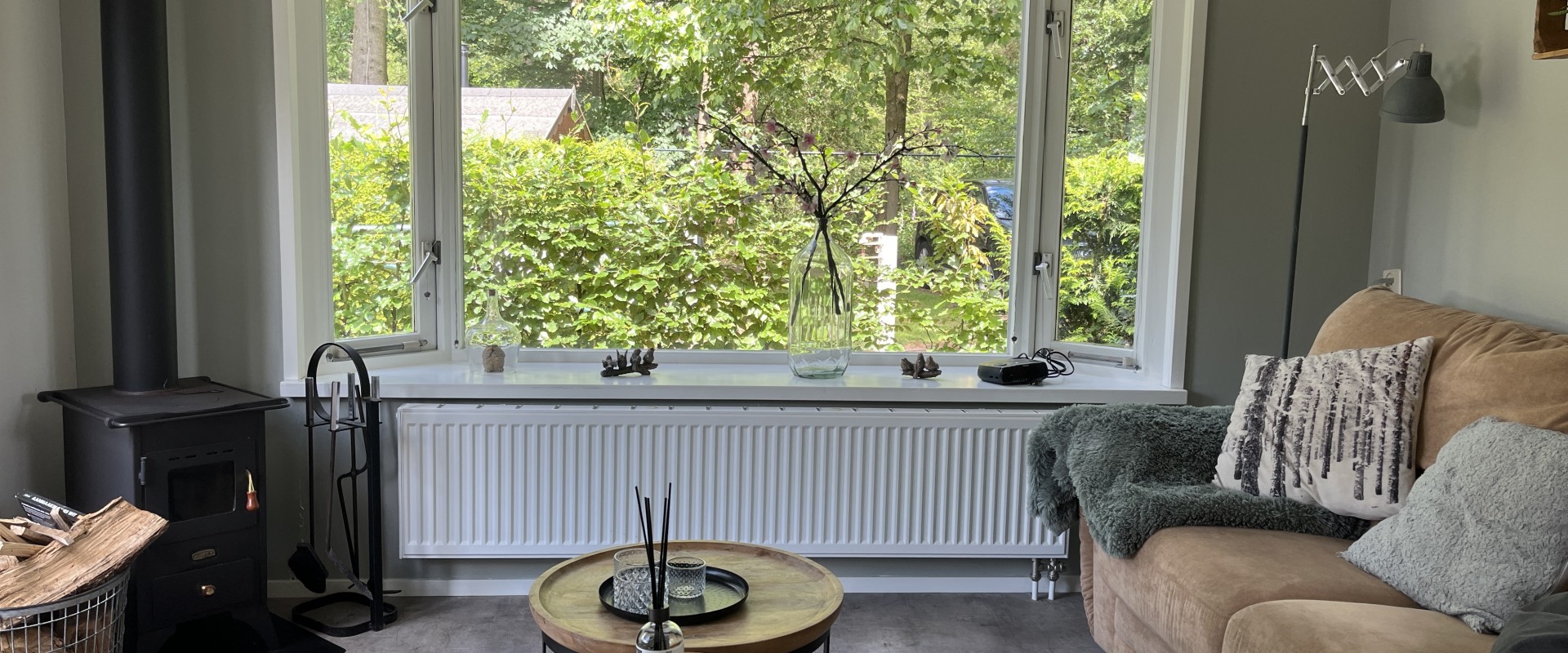 In de knusse woonkamer zorgen de centrale verwarming en het gezellige houtkacheltje voor een warme, huiselijke sfeer. De keuken is volledig uitgerust met gaskookplaat, magnetron, koelkast met vriesvak en een complete keukeninventaris. Een televisie met Digitenne-aansluiting maakt het helemaal af.